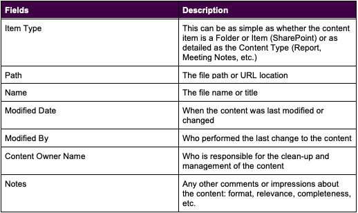As with any initiative regarding business content, we first need to understand the depth, breadth, and amount of content that exists, as well as some key information about the content itself. Starting with a high-level inventory, identify the content repositories (Document Management systems, file shares, Google Drive, SharePoint document libraries, CMS systems, etc.) and capture information about each piece of content using the key fields in the table below. If the content in scope for your current effort is somewhere in the range less than 1000 items, you can do so manually, using a spreadsheet with columns for each of these fields: