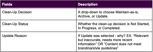 • Maintain as-is: Content item is up-to-date, relevant, and meets and branding and editorial guidelines. No recommended action.