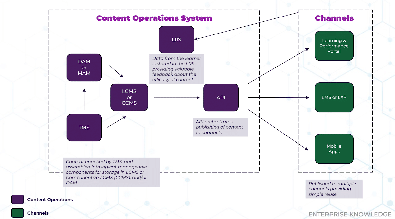 This learning technology stack connects to delivery channels such as Learning and Performance portals, LMSs or Learning Experience Platforms (LXPs), Mobile Apps, or any number of content delivery channels. An API (or integration) layer orchestrates this connection and enables different systems and channels to “talk” to each other and exchange content and data. The final piece in a learning technology stack is a Learning Record Store (LRS) that can collect data about your learner’s learning experience using the Experience API or xAPI standard. A LRS provides part of the feedback necessary to drive relevant changes to content so that learning content can better meet the needs of your learners. This learning ecosystem allows you to build more impactful reusable learning content and manage that content in an agile and efficient manner.