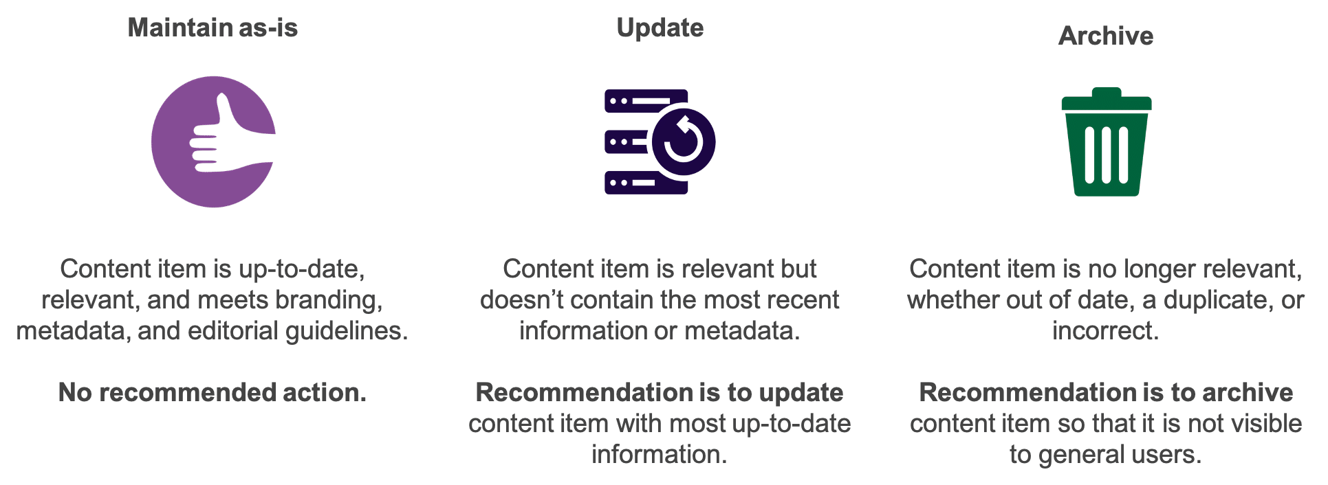 • EK analyzed the organization’s content against 6 evaluation parameters to determine what content needed to be updated, archived, or maintained-as-is. This resulted in an actionable content inventory, clean-up, and migration plan for the organization to systematically clean-up their content before migration.