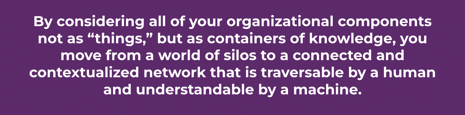 In the same way, products, equipment, processes, and facilities can all be considered knowledge assets. By considering all of your organizational components not as “things,” but as containers of knowledge, you move from a world of silos to a connected and contextualized network that is traversable by a human and understandable by a machine. We coined the term knowledge assets to express this concept. The key to a knowledge asset is that it can be connected with other knowledge assets via metadata, meaning it can be put into the organization’s context. Anything that can hold metadata and be connected to other knowledge assets can be an asset.