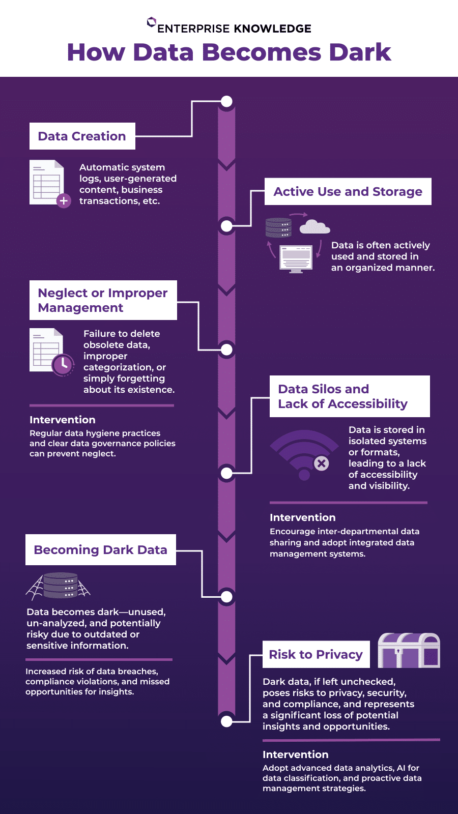 This infographic serves as your roadmap to understanding and uncovering dark data within your organization, showcasing practical interventions to secure and capitalize on your most underutilized assets. At Enterprise Knowledge, we specialize in transforming complex data landscapes into structured, actionable intelligence. If you’re ready to enhance your data management strategies and mitigate risks associated with dark data, reach out to our experts today for tailored solutions that empower your data governance efforts.
