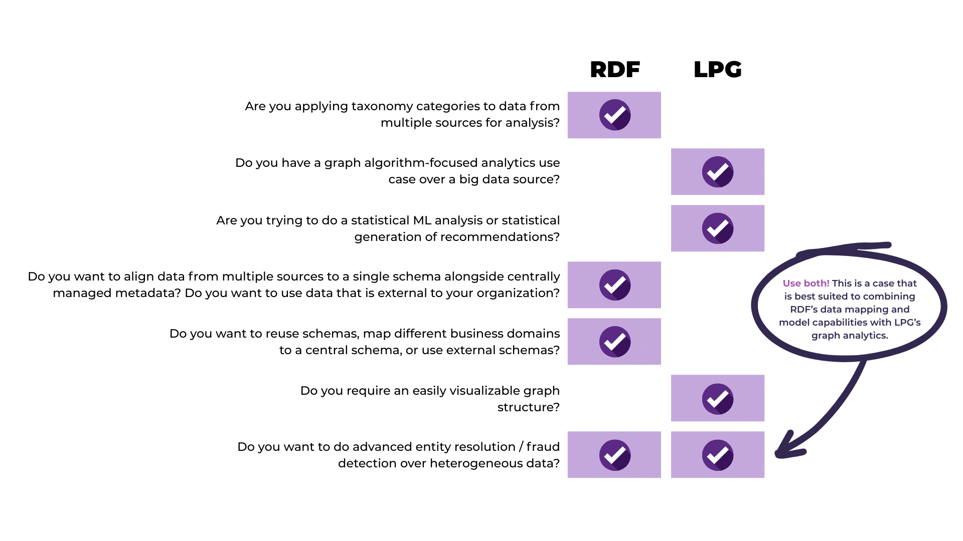 There are a number of differences between RDF graphs and LPGs, some of which we will get into. At their core, though, the differences between RDF and LPG stem from different approaches to information capture.
