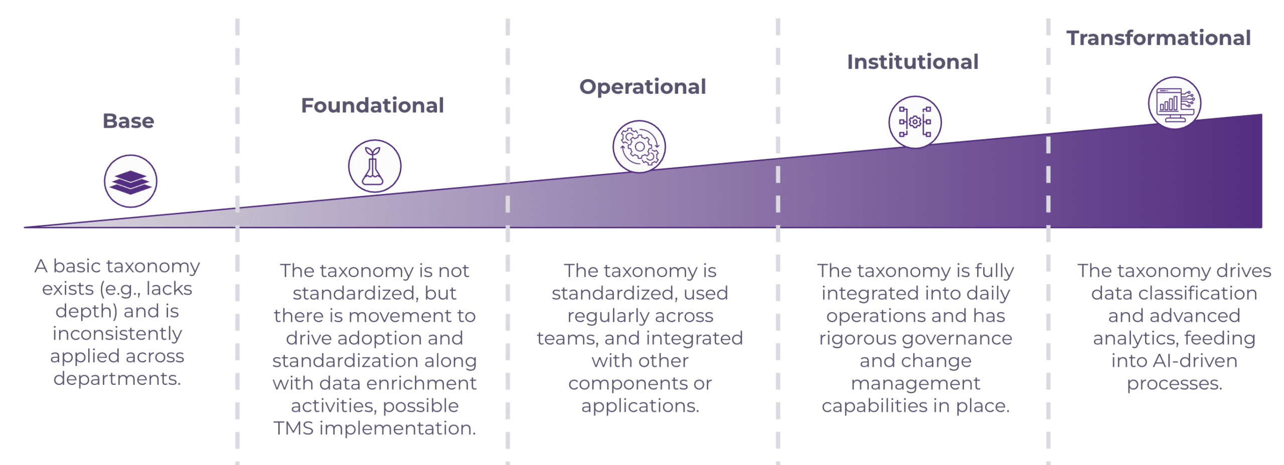 • At this stage of maturity, the taxonomy has been scaled to the extent that it can be considered an enterprise taxonomy; it covers all foundational areas, is utilized by all business units, and is poised to support key organizational operations. At this stage, the taxonomy drives a key enterprise-level use case.